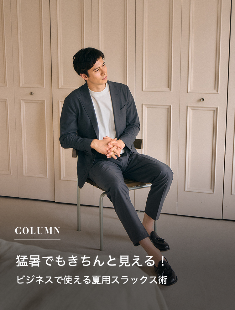 例えば、定番的なジャケパンスタイルも足元に素肌をのぞかせるだけで着崩したムードになり、ビジネス感の緩和が可能。華やかさが足りない場合は、ポケットチーフを差すと解決できます。