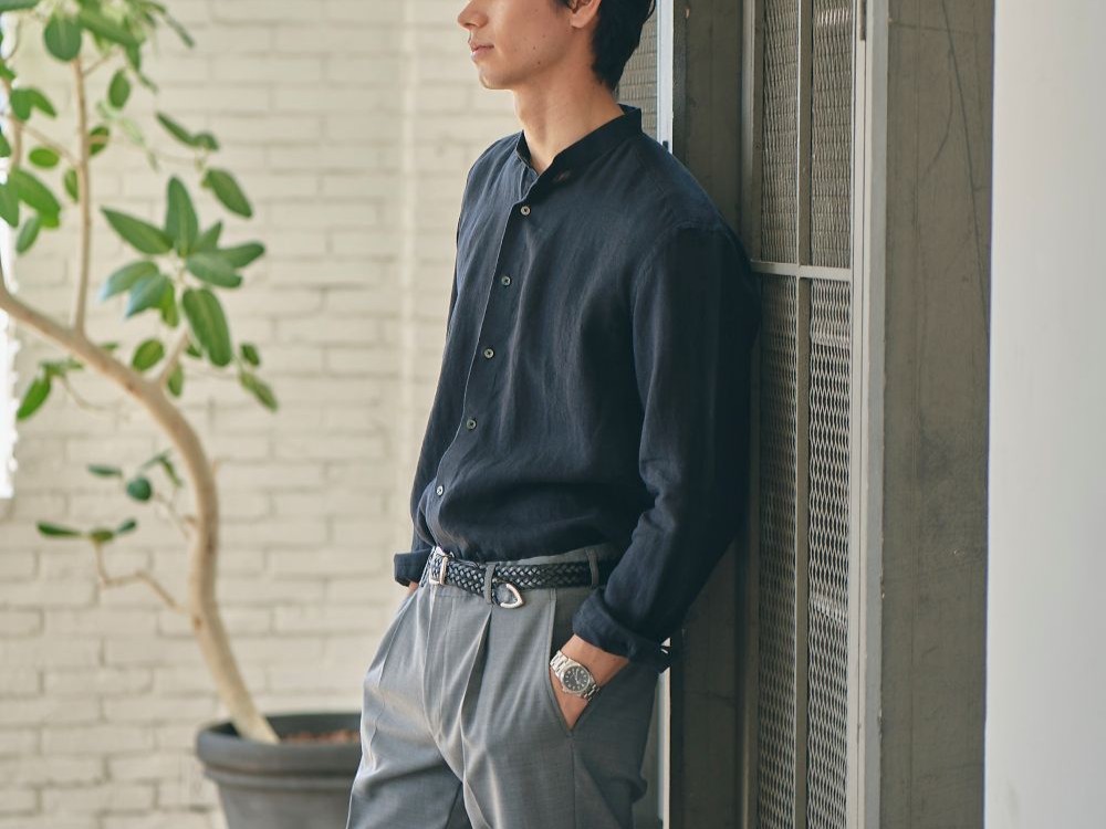 最近は「スタンドカラー」「バンドカラー」も人気です。襟付きシャツとカジュアルシャツの中間的な印象をで、適度なカジュアル感。上品すぎずカジュアルすぎないバランスが絶妙で、ジャケットを羽織る際にも重宝します。2つの襟型を同一視するケースもありますが、原則として、スタンドカラーは適度な高さがあり、バンドカラーは台襟のみで襟がない仕様。夏場は首元の通気性を妨げにくいバンドカラーがおすすめです。