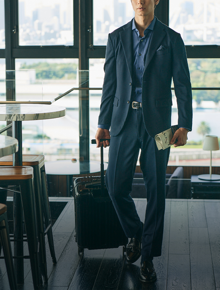 アイテム自体のデザインとしては、少しリラックス感のあるほうがシワは気にならなくなります。その意味では、スーツスタイルよりもビジネスカジュアルなどのほうが好都合。シルエットに適度な余裕のあるセットアップを活用するのがおすすめです。セットアップには防シワ性の高いアイテムが多いので、そんな機能的なセットアップが1着あると、旅先でコーディネートに困らなくて便利です。もちろん、〈SOLVE(ソルブ)〉にも高機能なセットアップが揃っています。