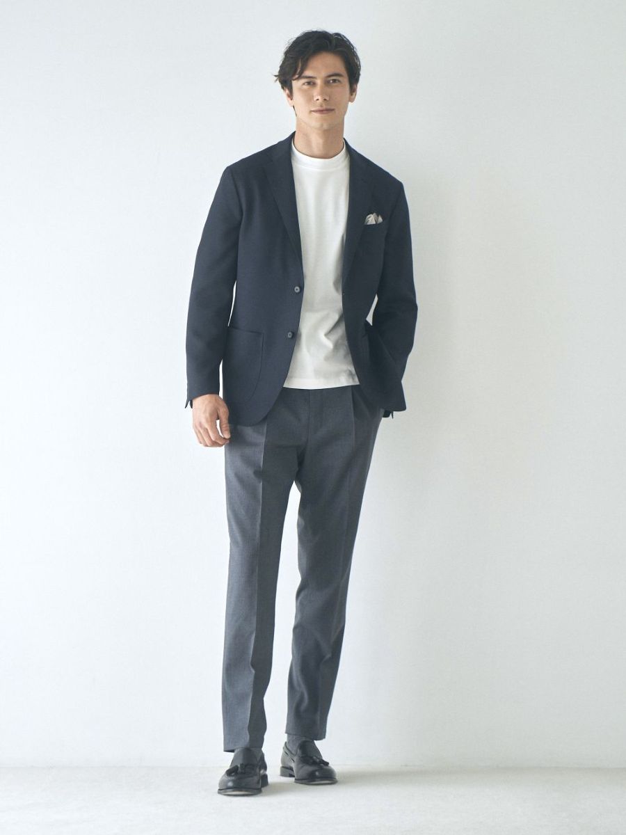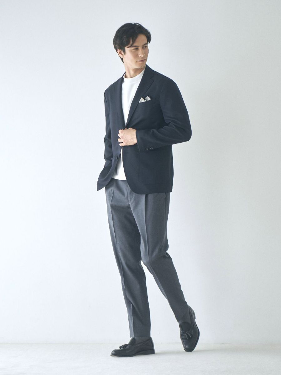 ウールのような表面感が特徴のソフトなポリエステル生地で仕立てたオールシーズンで使いやすいジャケットです。パウダータッチのさらっとした肌触りなので暖かい季節でも着用しやすく、程良い肉感のツイル生地の為、秋冬でも使いやすい生地感です。2WAYストレッチで防しわ性もあり、上品な見た目と扱いやすさを備えた、一年を通して重宝できる一着です。