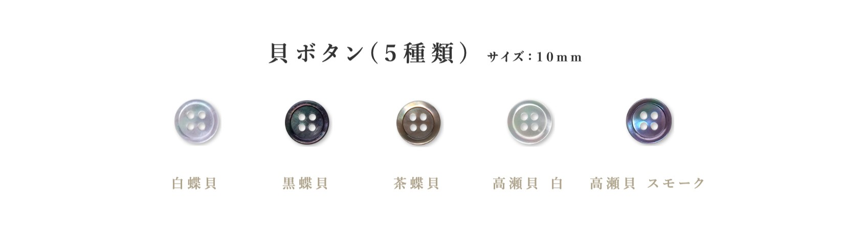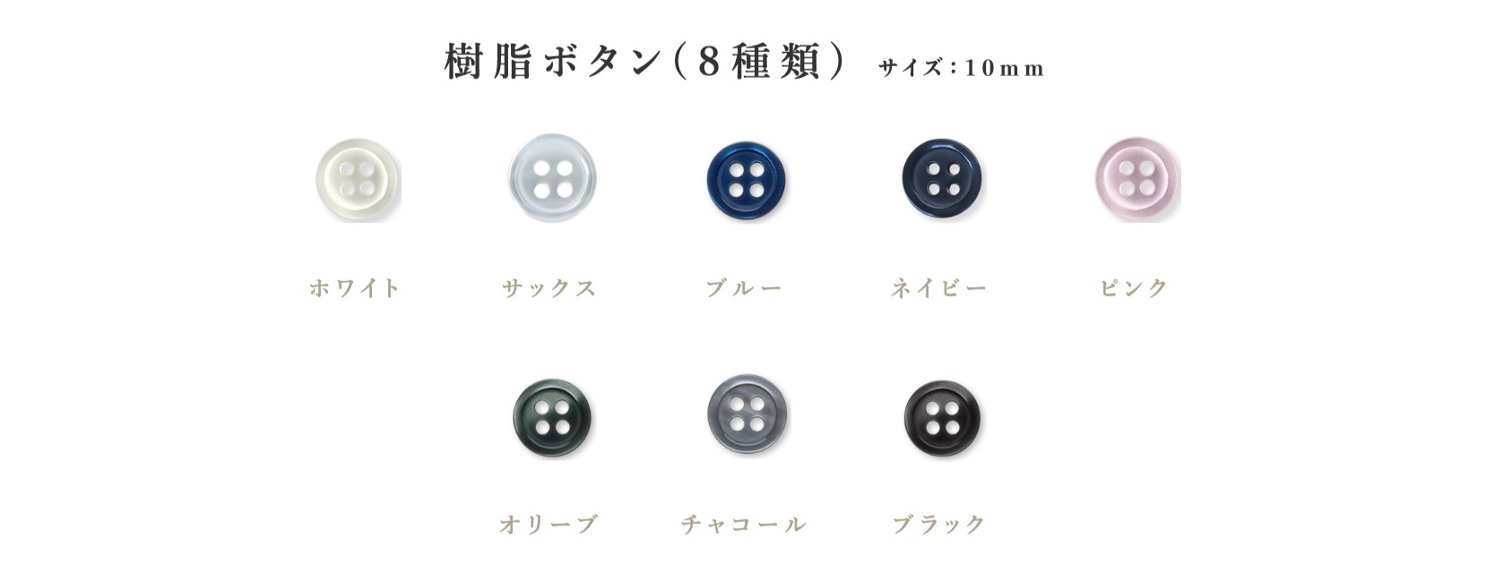 ボタンは、貝ボタン5種 / 樹脂ボタン(10mm)8種 / 水牛調樹脂ボタン(15mm)6種 の計19種類の中からお選びいただけます。