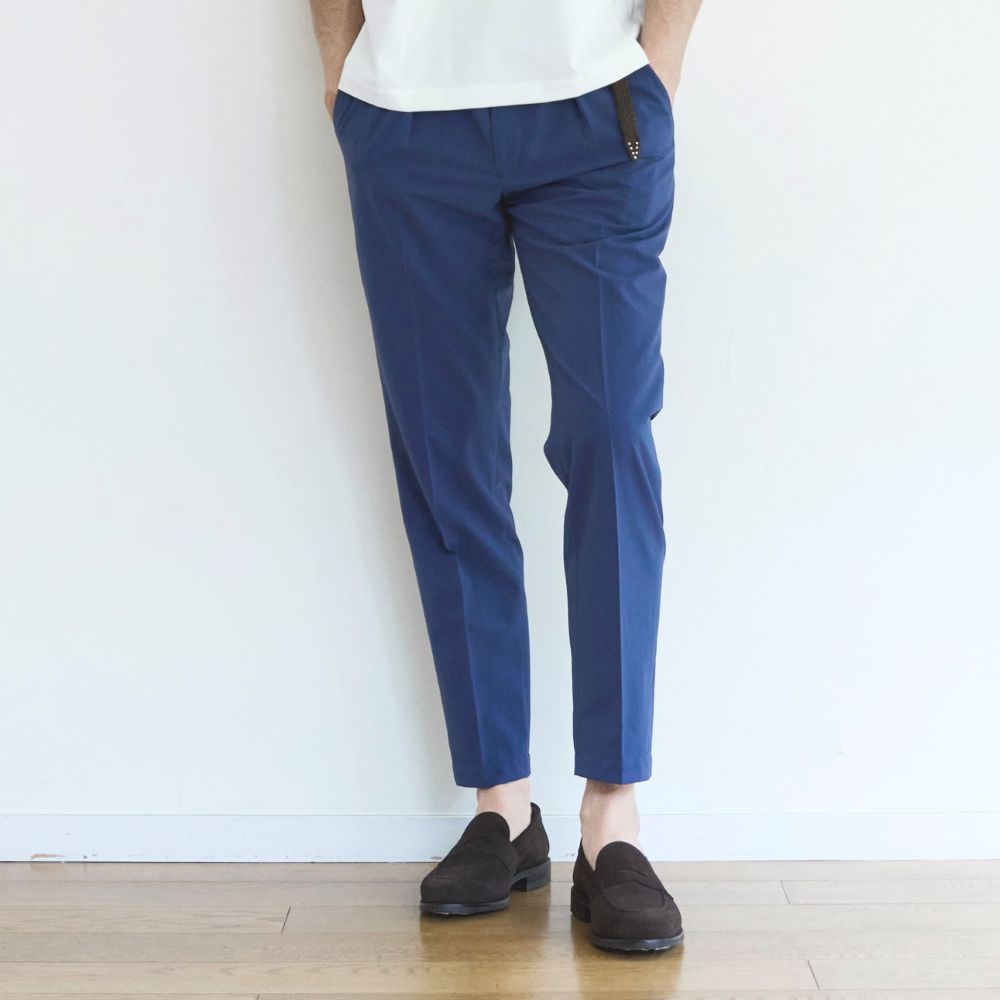 カラーバリエーションは、ライトネイビー、ダークネイビー、チャコールグレー、ベージュ、ライトベージュの5色をご用意。生地の表面にシワ加工を施しナチュラルな表情に仕上げた生地で、非常に細かい通気孔があるため、通気性に優れておりサラッとした肌ざわりで夏に最適な生地感です。