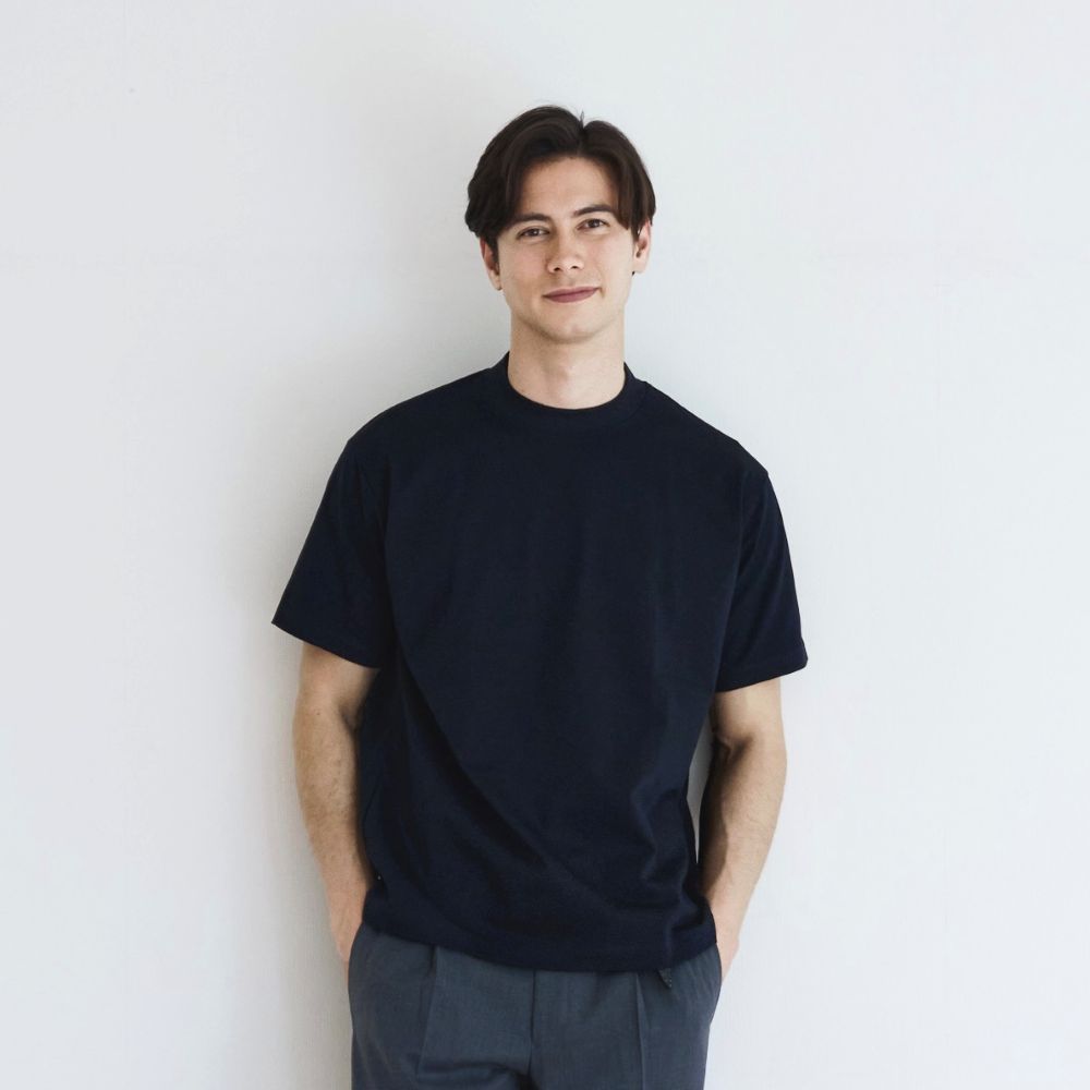 ジャケットスタイルに合わせやすく、ビジネスシーンでも品よく着こなせるモックネックTシャツ。少し短めの着丈設計で、裾まわりがダブつきにくく、すっきりと着用できます。テレワークやビジネスカジュアルにも重宝できる1着です。