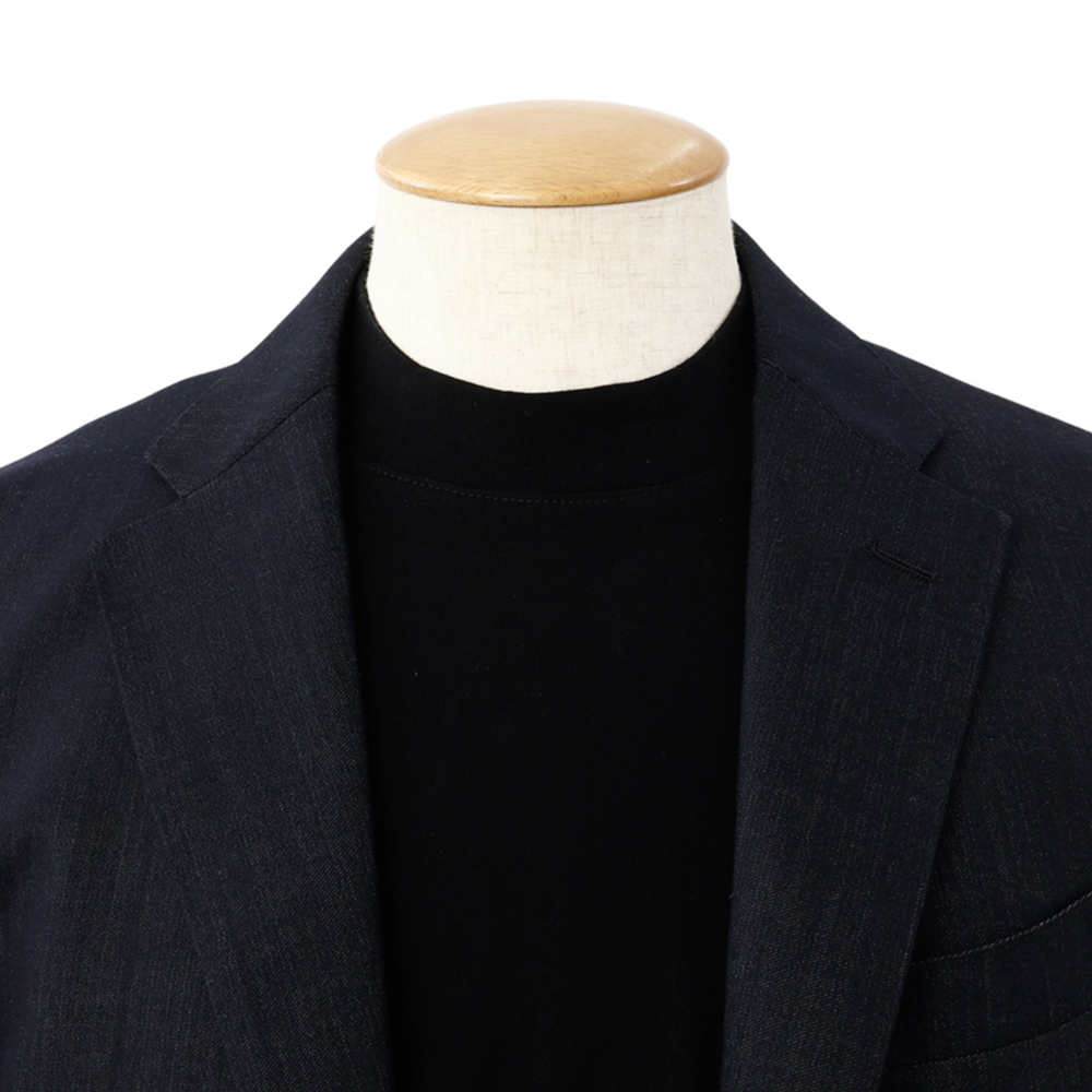 高めの襟巾が上品な印象の首元は、後ろ襟にかけてリブが高くなるように設計された変形モックネック仕様。首まわりに程よい高さと締まりを持たせることで、Tシャツでも大人らしい洗練された印象を作り出します。 一枚で着ても品良く決まり、もちろんジャケットとの相性も抜群。アウター着用時には襟元の汚れもカバーしてくれます。