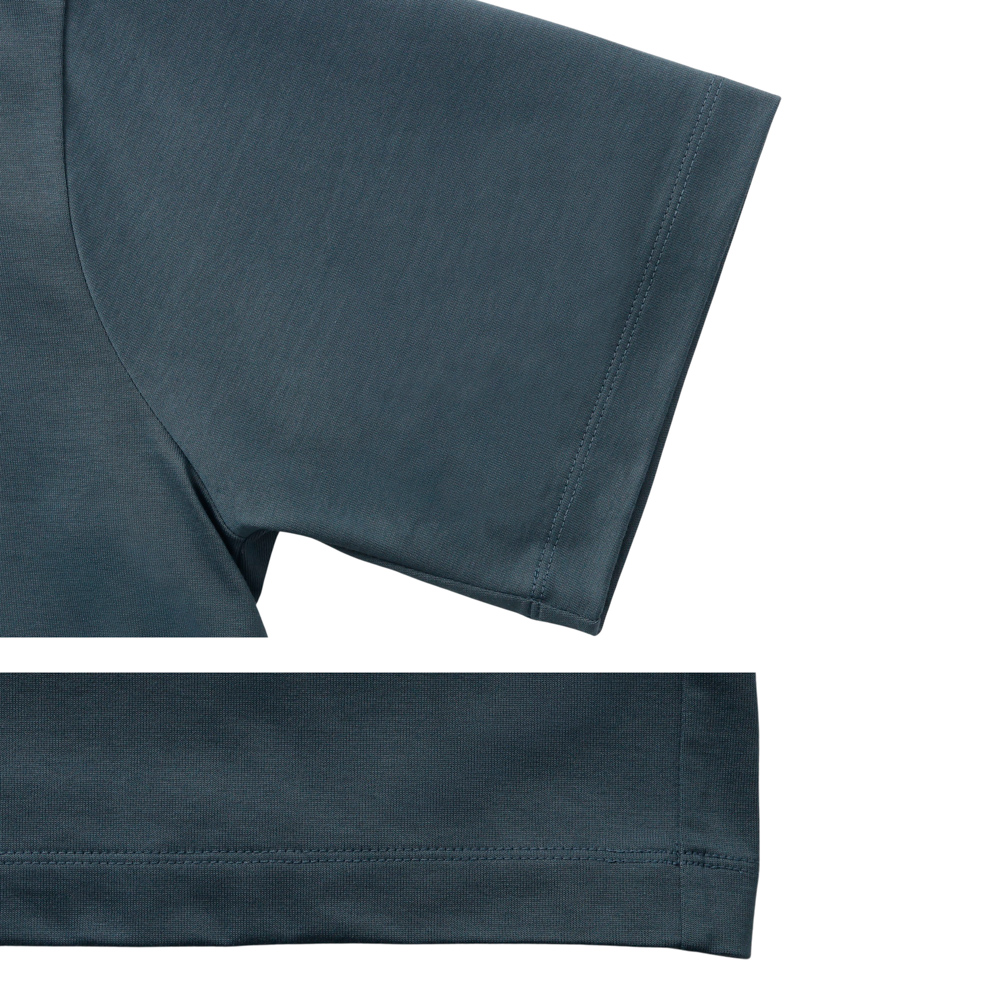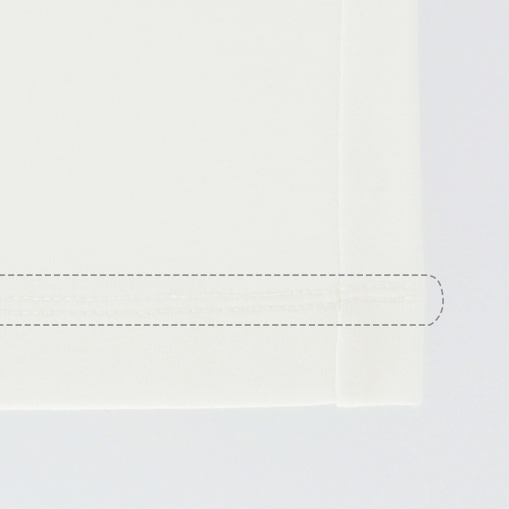 高めの襟巾が上品な印象の首元は、後ろ襟にかけてリブが高くなるように設計された変形モックネック仕様。首まわりに程よい高さと締まりを持たせることで、Tシャツでも大人らしい洗練された印象を作り出します。 一枚で着ても品良く決まり、もちろんジャケットとの相性も抜群。アウター着用時には襟元の汚れもカバーしてくれます。