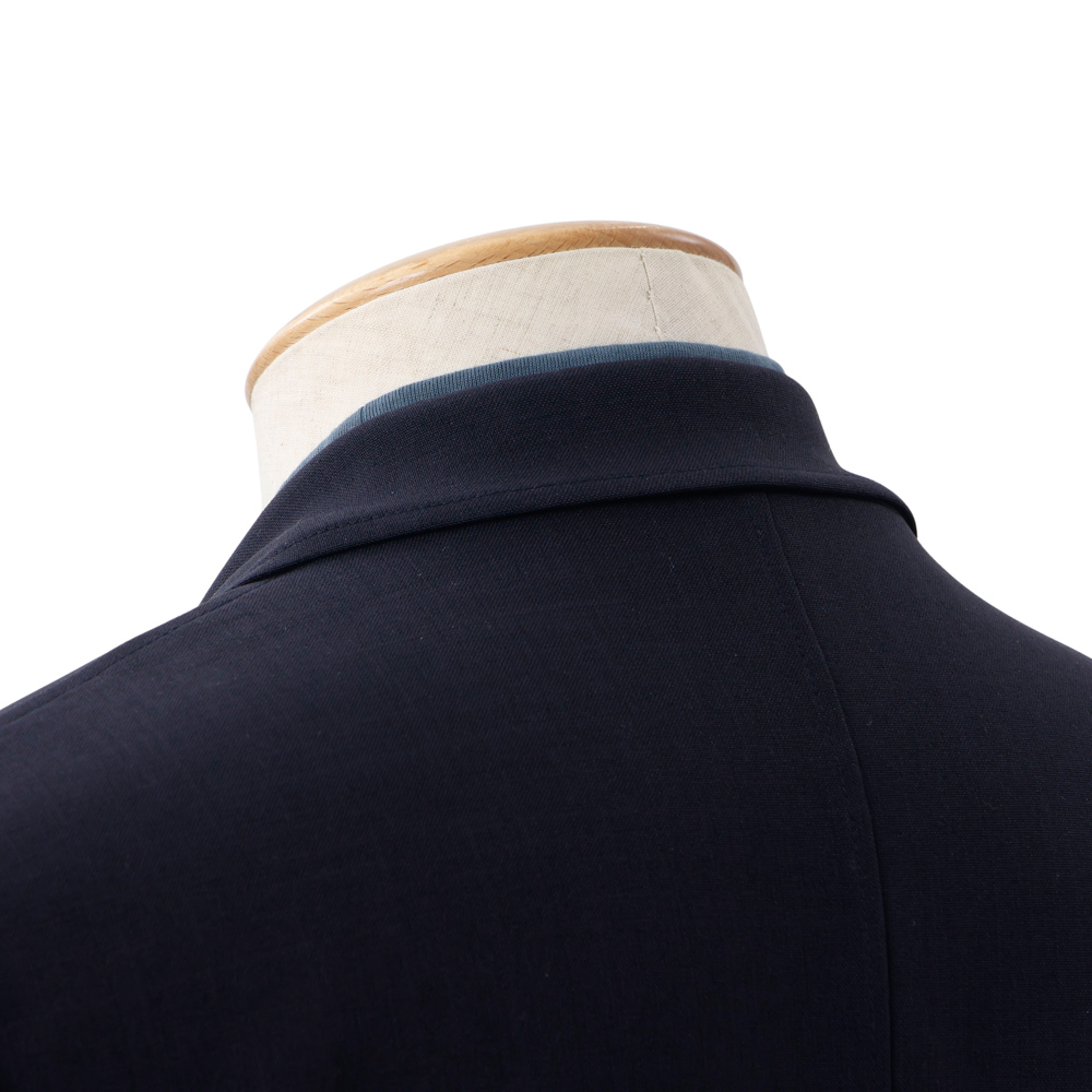 袖はカマ底(脇下部分)の構造ラインをずらす事により前振りの袖付けにしており、着用感とジャケット着用時のおさまりの良さを考慮しました。