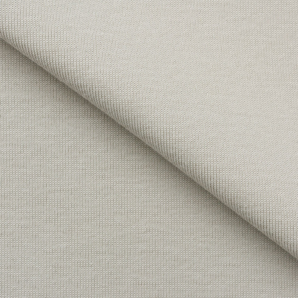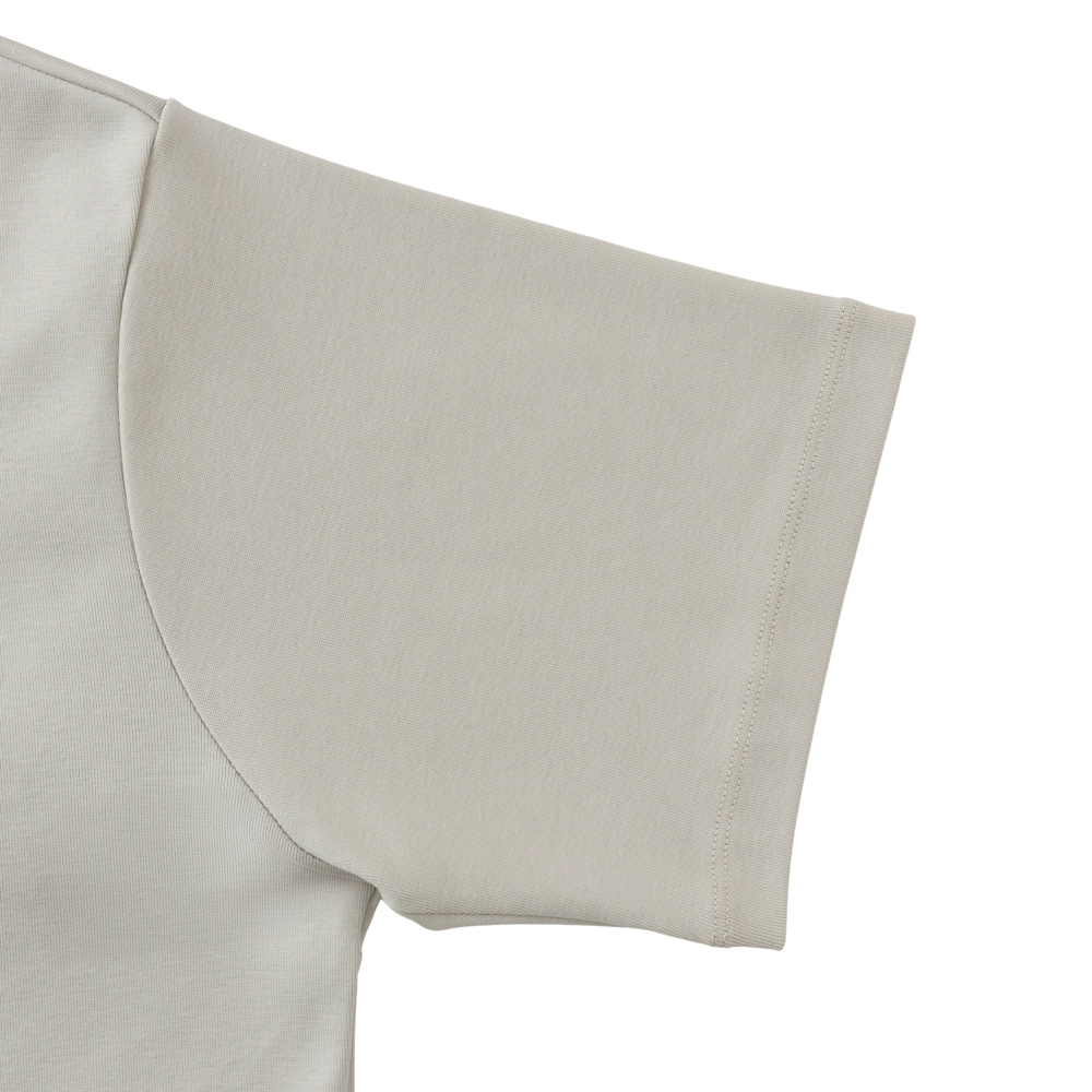 生地には、ほどよい厚みとハリを備えたソフトなフライス生地を採用。透けにくく、一枚での着用も安心感があり、伸縮性が高いため動きやすさも抜群です。強撚糸ならではのさらりとした清涼感があり、肌離れの良い上質な着心地を楽しめます。
